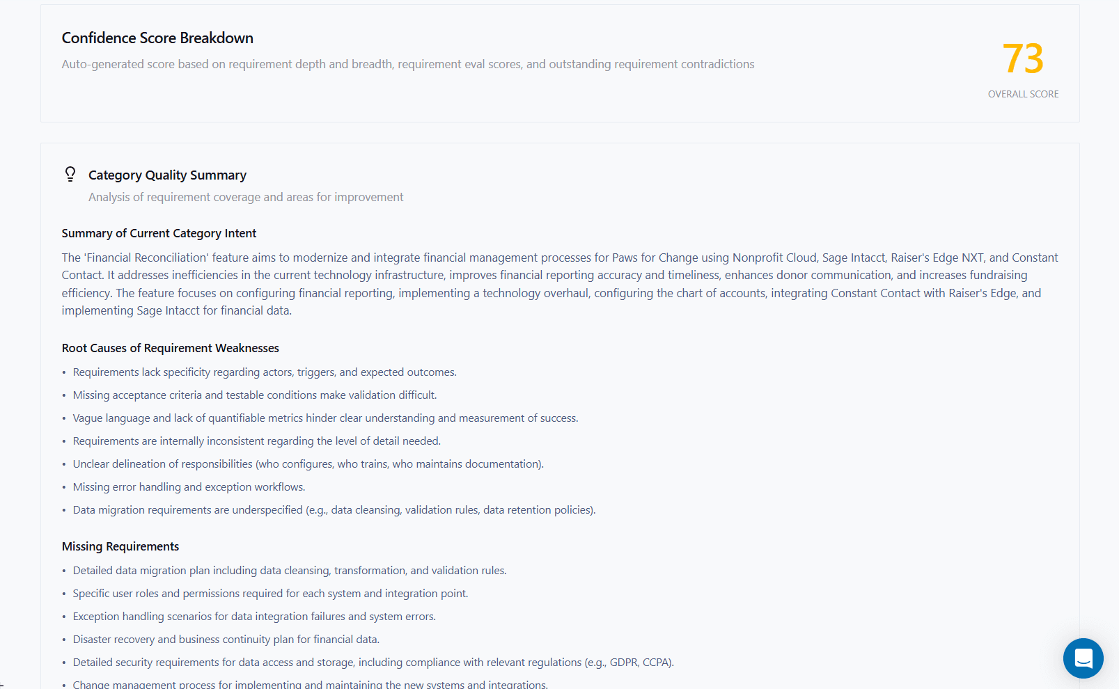 Glossa identifies missing requirements within the category, so you can add them now - and not in the form of rework once build's started.